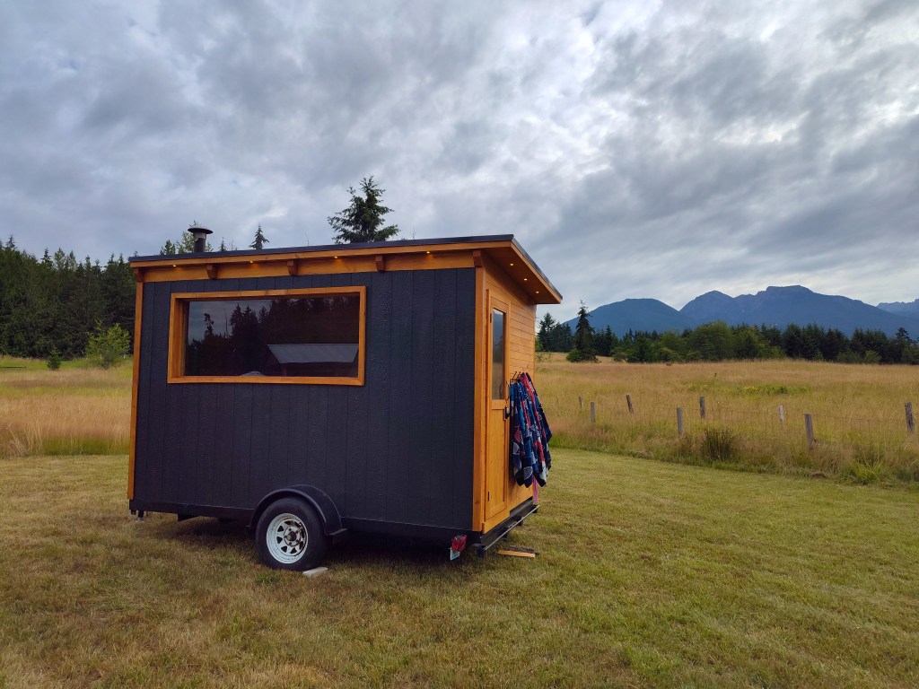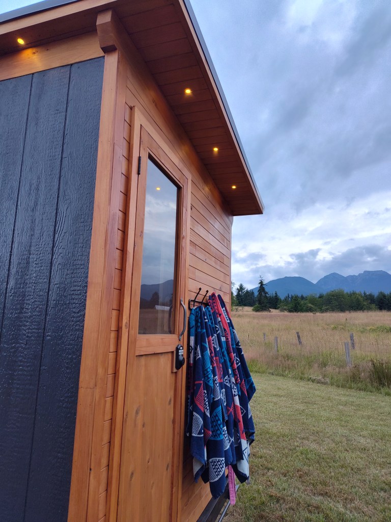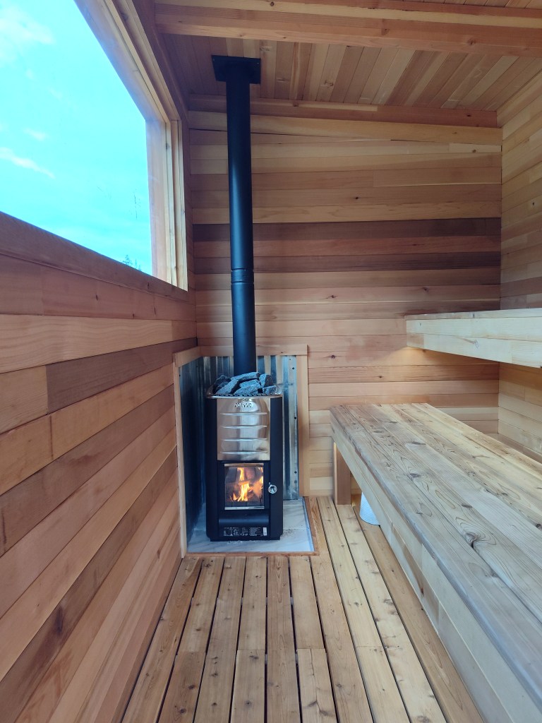 The thoughtfully crafted sauna is lined with cedar floor to ceiling. Its entirely self contained, wood fired, and lighting is solar powered. The best part, its on wheels so it goes where we want it to. Installed is a powerful Harvia wood burning heater. Wood heat is the traditional method for sauna heating and those that use it know that it just hits different.