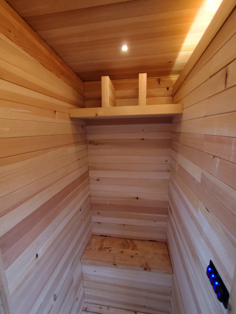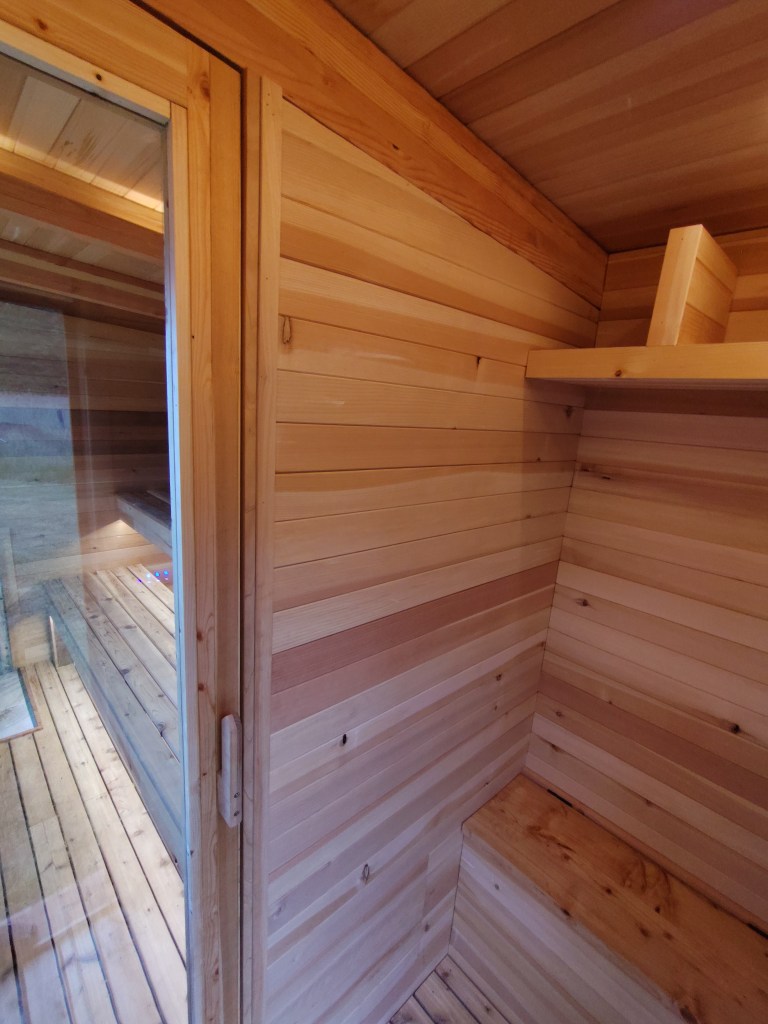 The Sauna was built with a traditional layout in mind. With space for 6-8 depending on your coziness level. The hot room has the elevated benches above the heater for a true “toes above stoves” experience. Then the warm room or change vestibule. Here there is space to get changed into or out of your bathing suit.